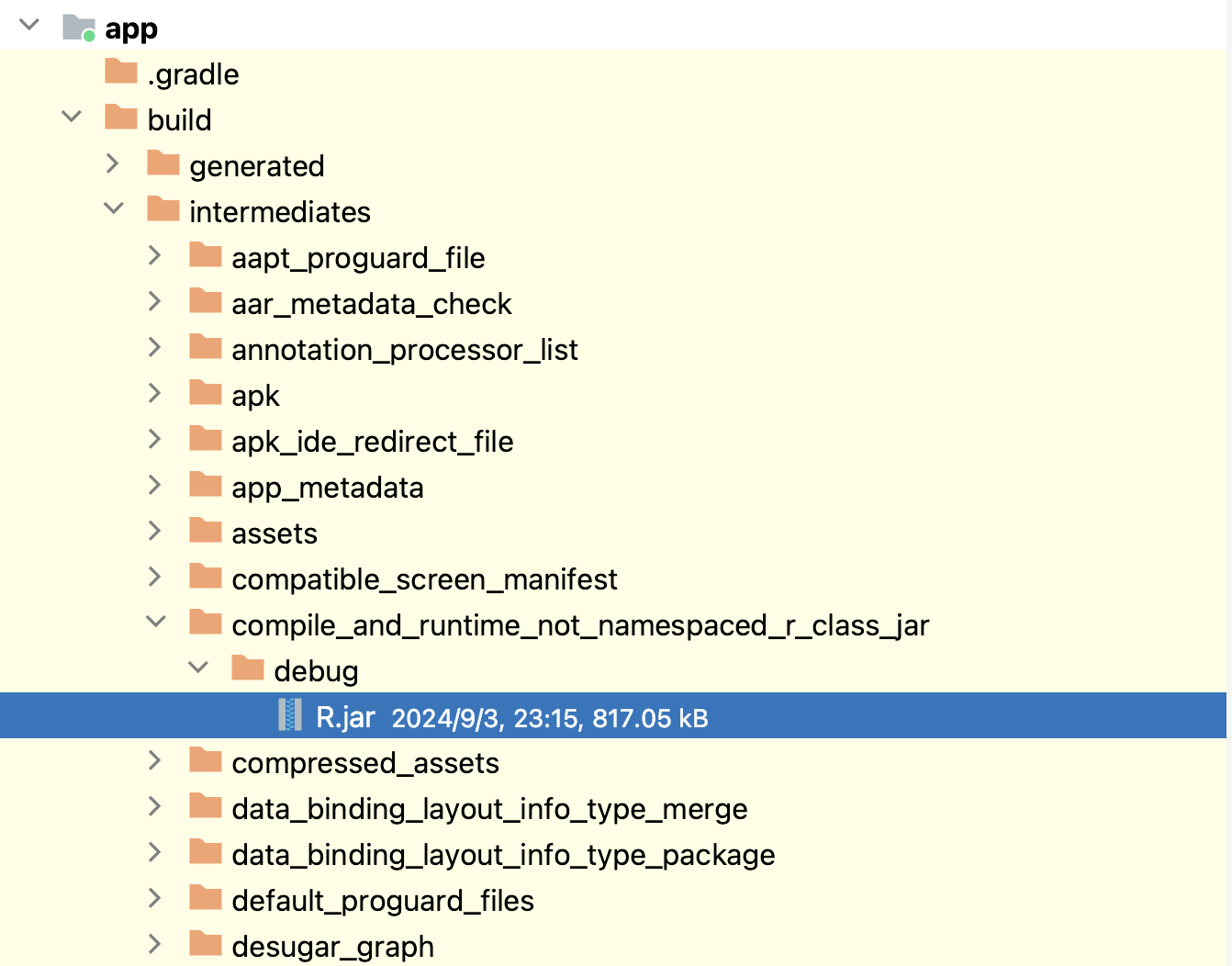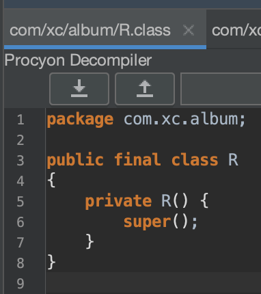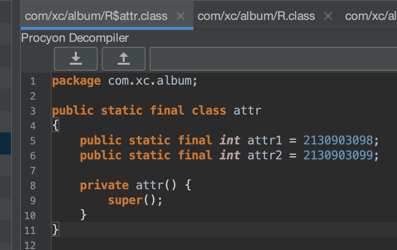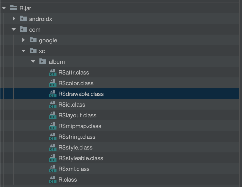 该文件在app/build/intermediates/compile_and_runtime_not_namespaced_r_class_jar/debug/R.jar,反编译该jar文件: