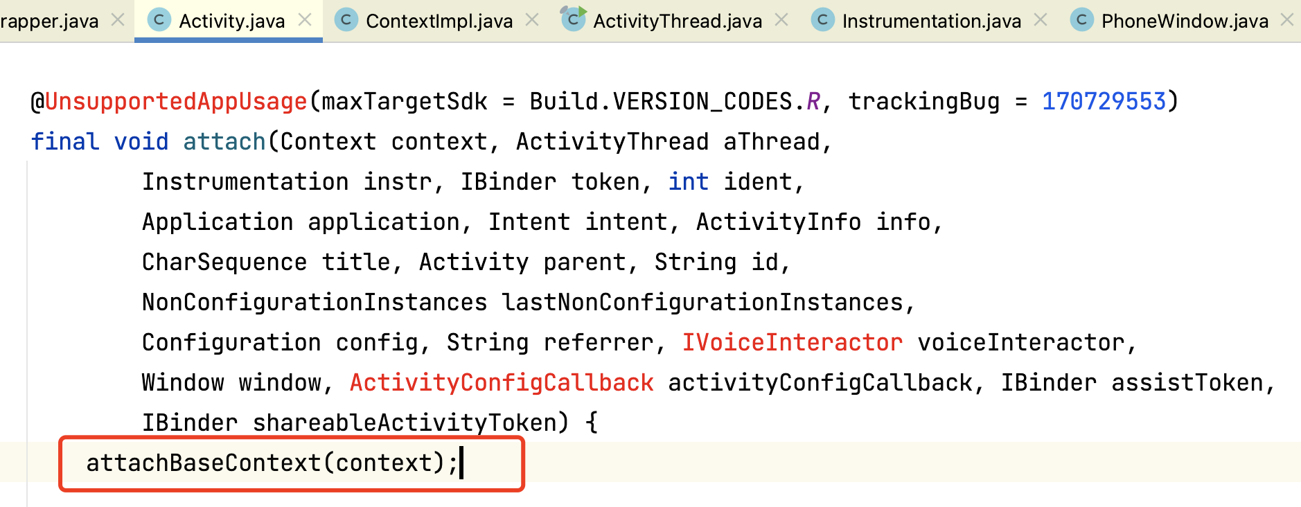 在activity中的attach调用了attachBaseContext,并把contextImpl传进去了: