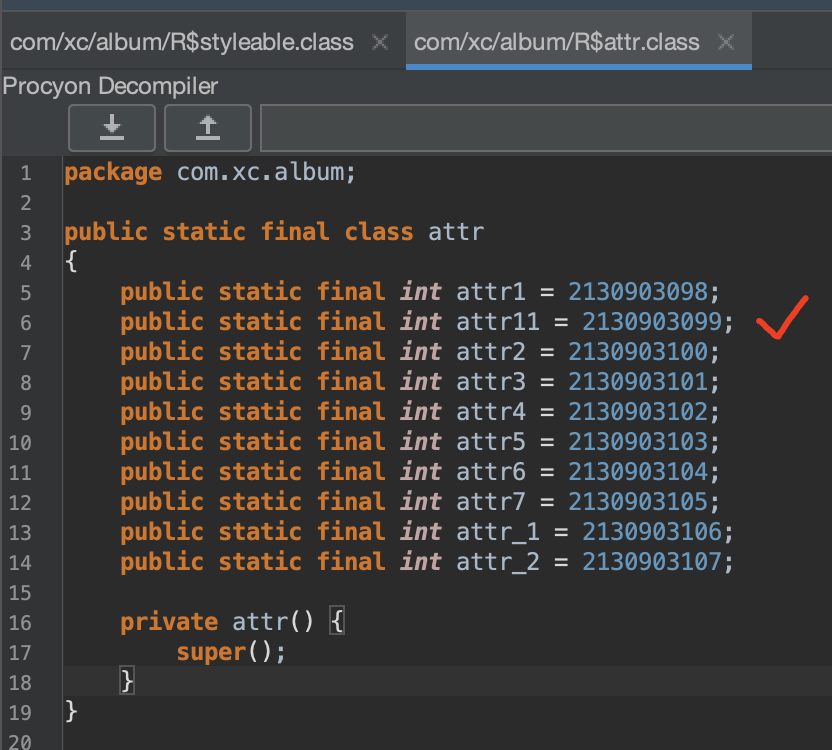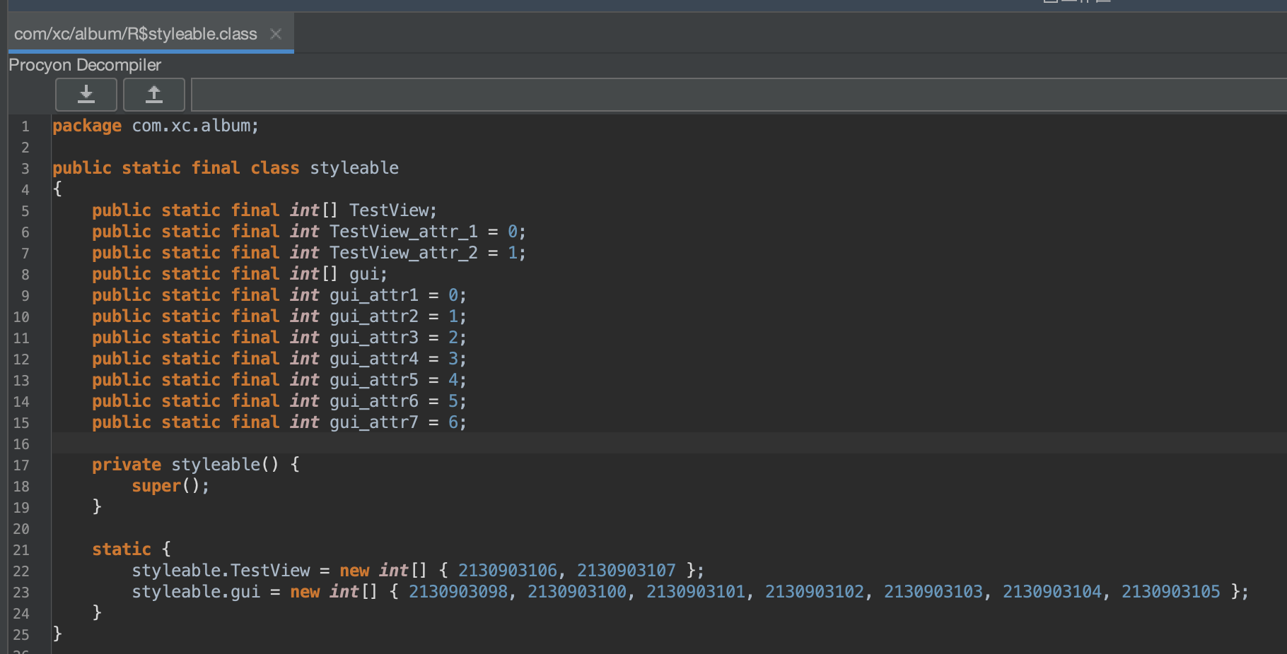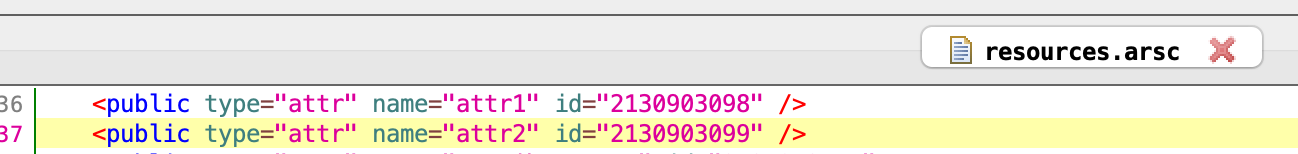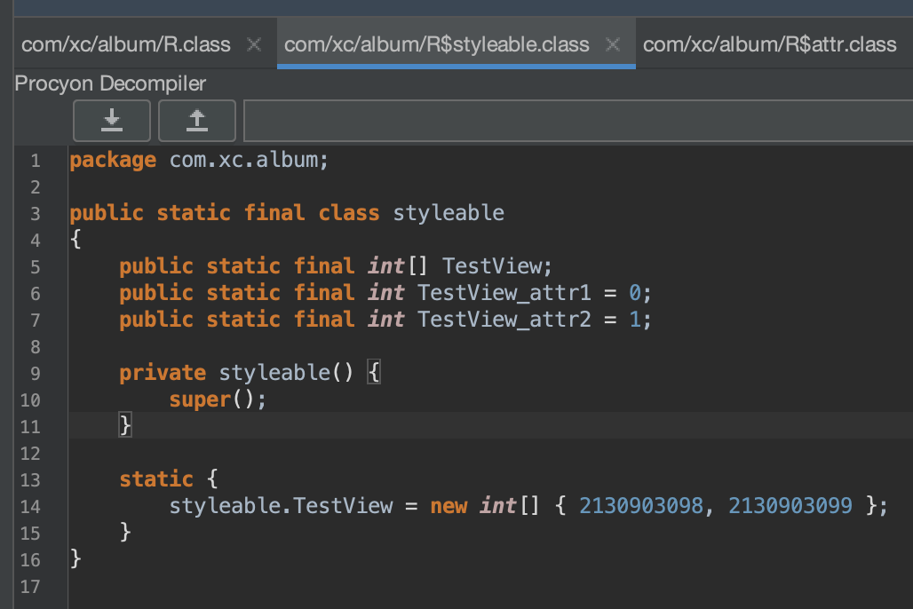 生成了一个R$styleable.TestView的数组和两个int值,分别是R$styleable.TestView_attr1和R$styleable.TestView_attr2,它两分别代表TestView数组的索引,而对应的值是定义在resource.arsc文件中: