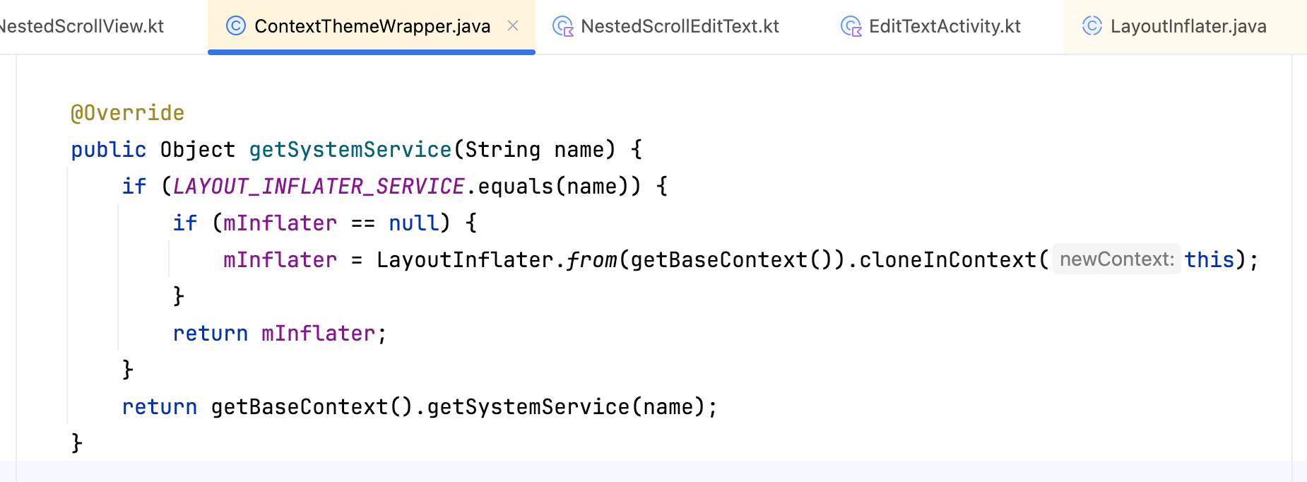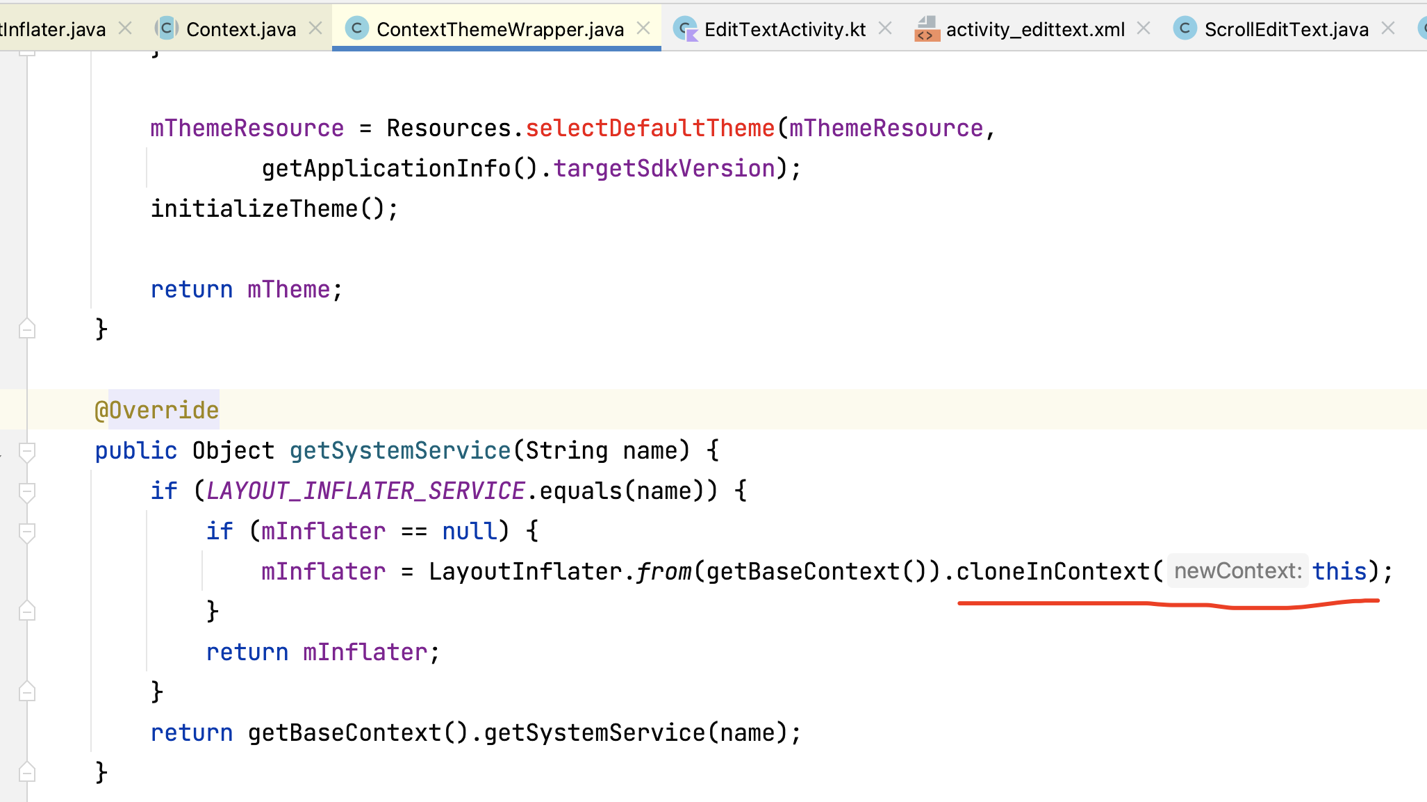如果from中传入的是activity,在contextThemeWrapper的getSystemService方法中获取到PhoneLayoutInflater后,又调用了cloneInContext,将当前的context传入其中: