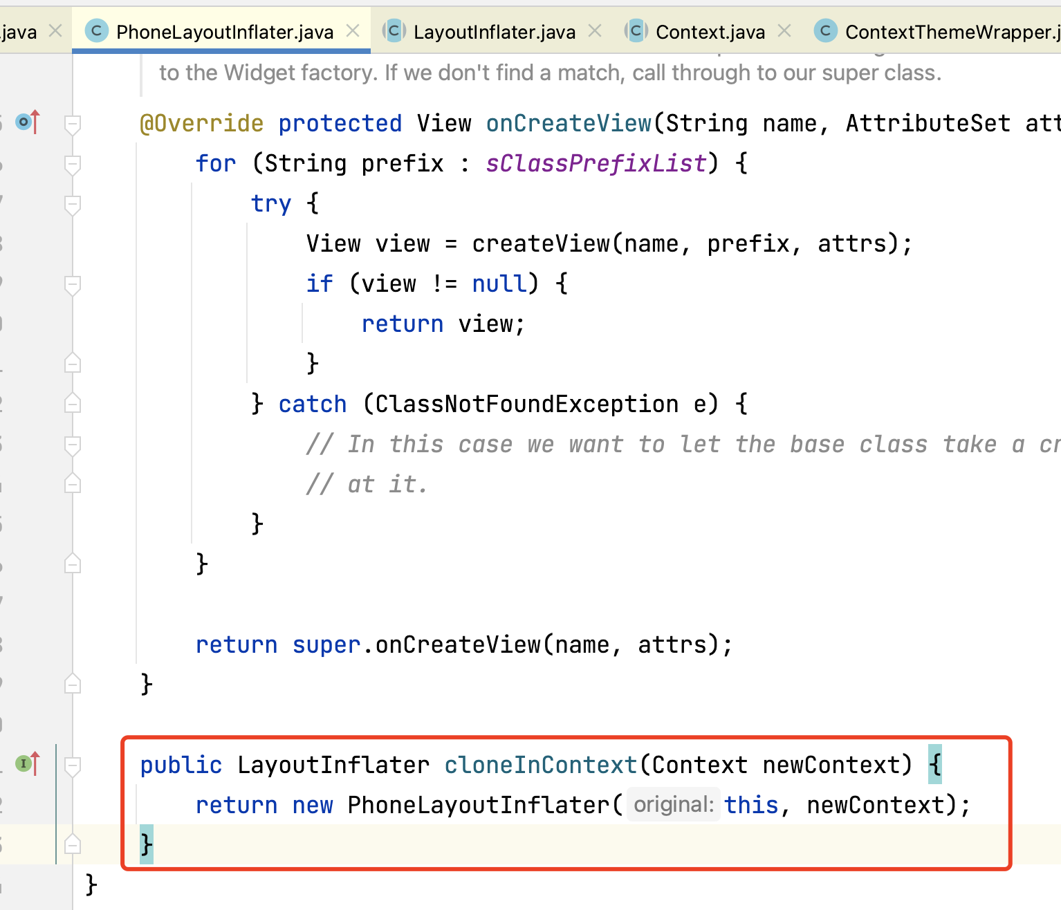 此处为什么要通过cloneInContext构造一个新的PhoneLayoutInflater呢? 在上面分析PhoneLayoutInflater创建的时候,是通过SystemServiceRegistry的SYSTEM_SERVICE_FETCHERS中map获取的,而在传入PhoneLayoutInflater的context是通过ContextImpl的getOuterContext方法来获取的,上面分析过ContextImpl的outerContext可能是Activity,也可能是Application,比如在A这个Activity中创建了PhoneLayoutInflater,而在B这个Activity中获取PhoneLayoutInflater的时候,如果没有cloneInContext,那么获取还是A这个activity中的PhoneLayoutInflater,而layoutinflater解析xml是强依赖于context,所以为了确保当前activity创建的layoutinflater使用的是当前context,所以将当前的context传入其中构造一个新的layoutinflater。