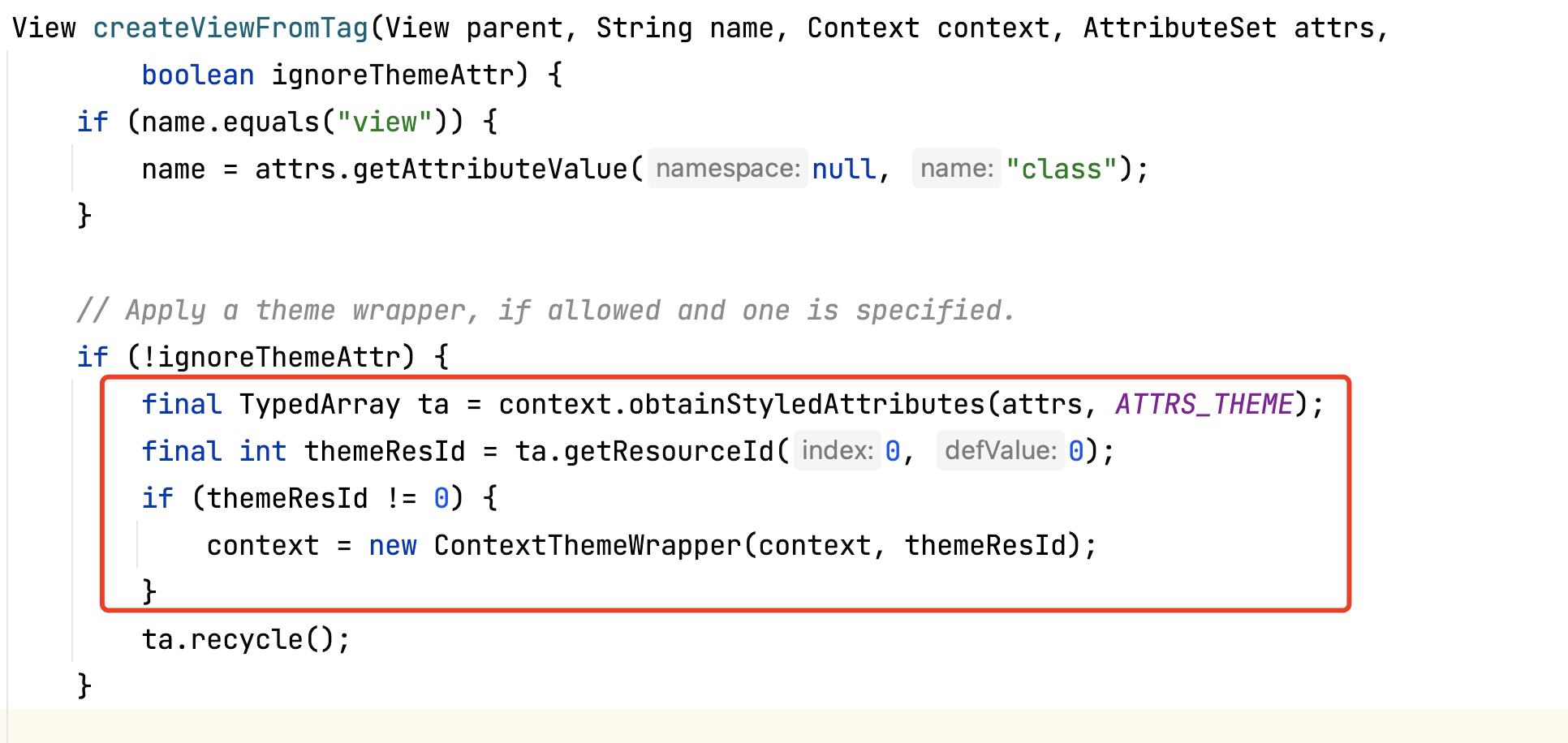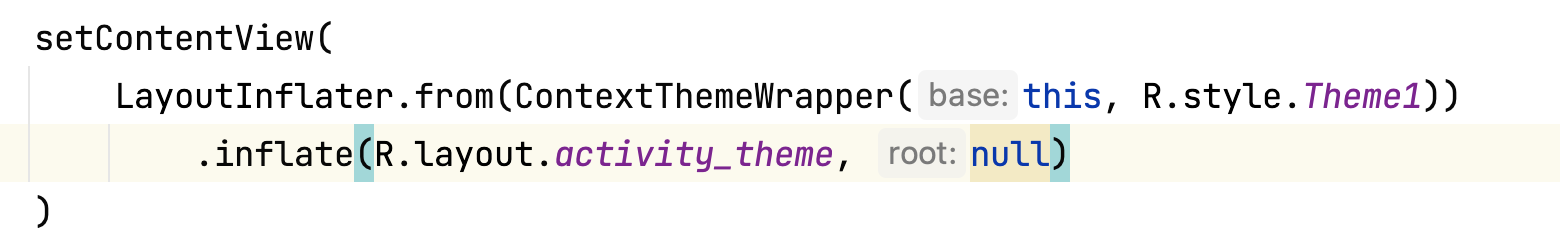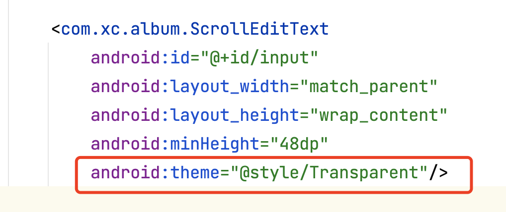 此处定义了一个theme属性,那么给该view的构造器传入的context就是一个contextThemeWrapper对象。所以view的context不一定是activity的context,如果设置了theme属性,那么就是一个contextThemeWrapper的context。
