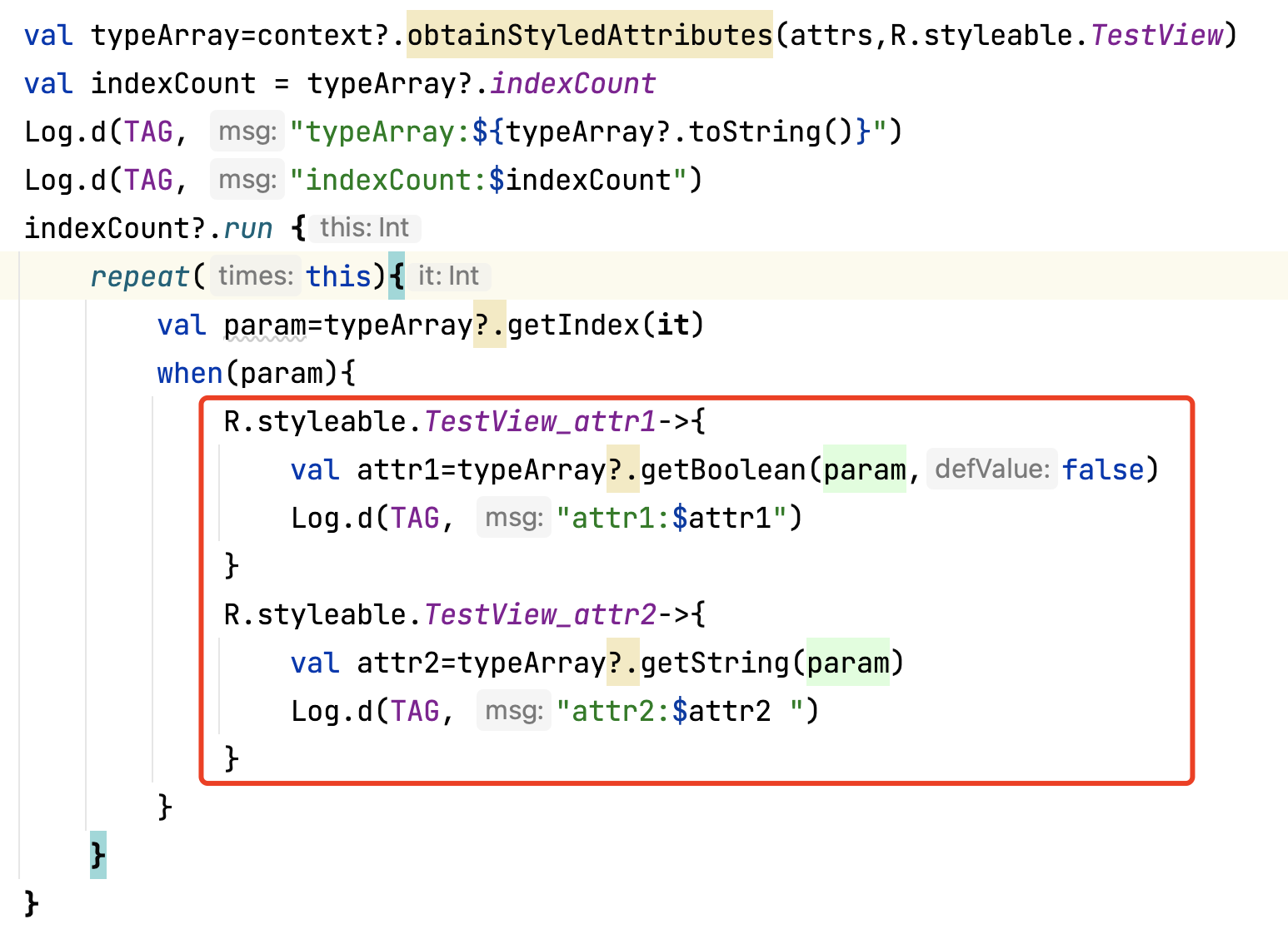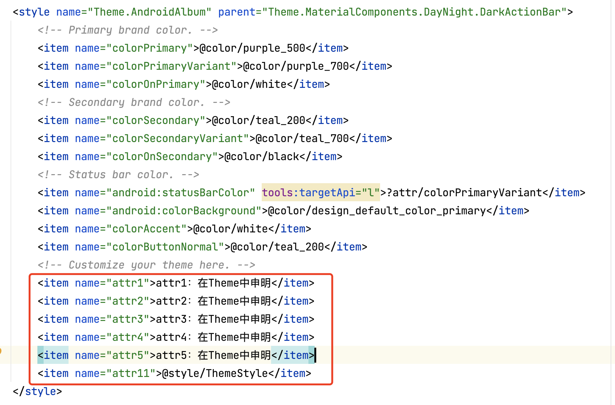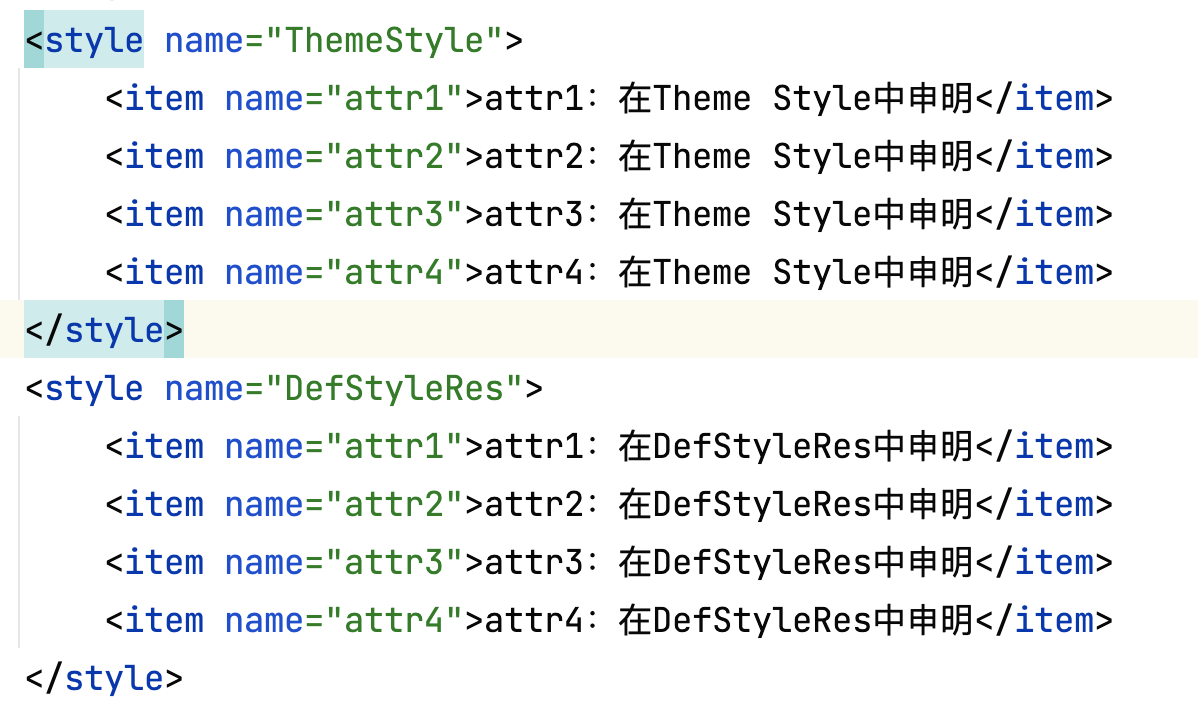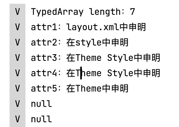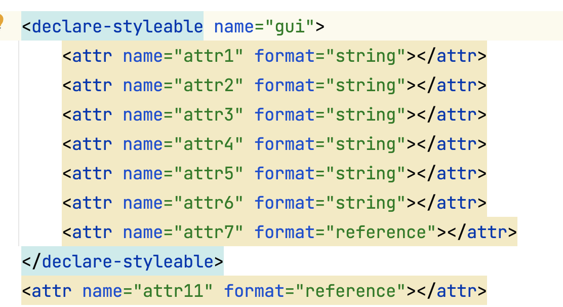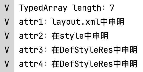 R.styleable.gui总共长度是7,attr1用的xml中定义的,attr2是布局中定义的style中的属性,attr3和attr4取的是theme中attr11定义的attr3和attr4,由于attr5没有在attr11中的style中定义,所以取的是theme中的attr5属性。 优先级:布局中的attr>布局中的style中的attr>defStyleAttr中的attr>theme中的attr 此时无论怎么在DefStyleRes中定义属性,都不会在该style里面的attr取值,因为此时定义了defStyleAttr 此时如果去掉defStyleAttr,则会在DefStyleRes中取值: