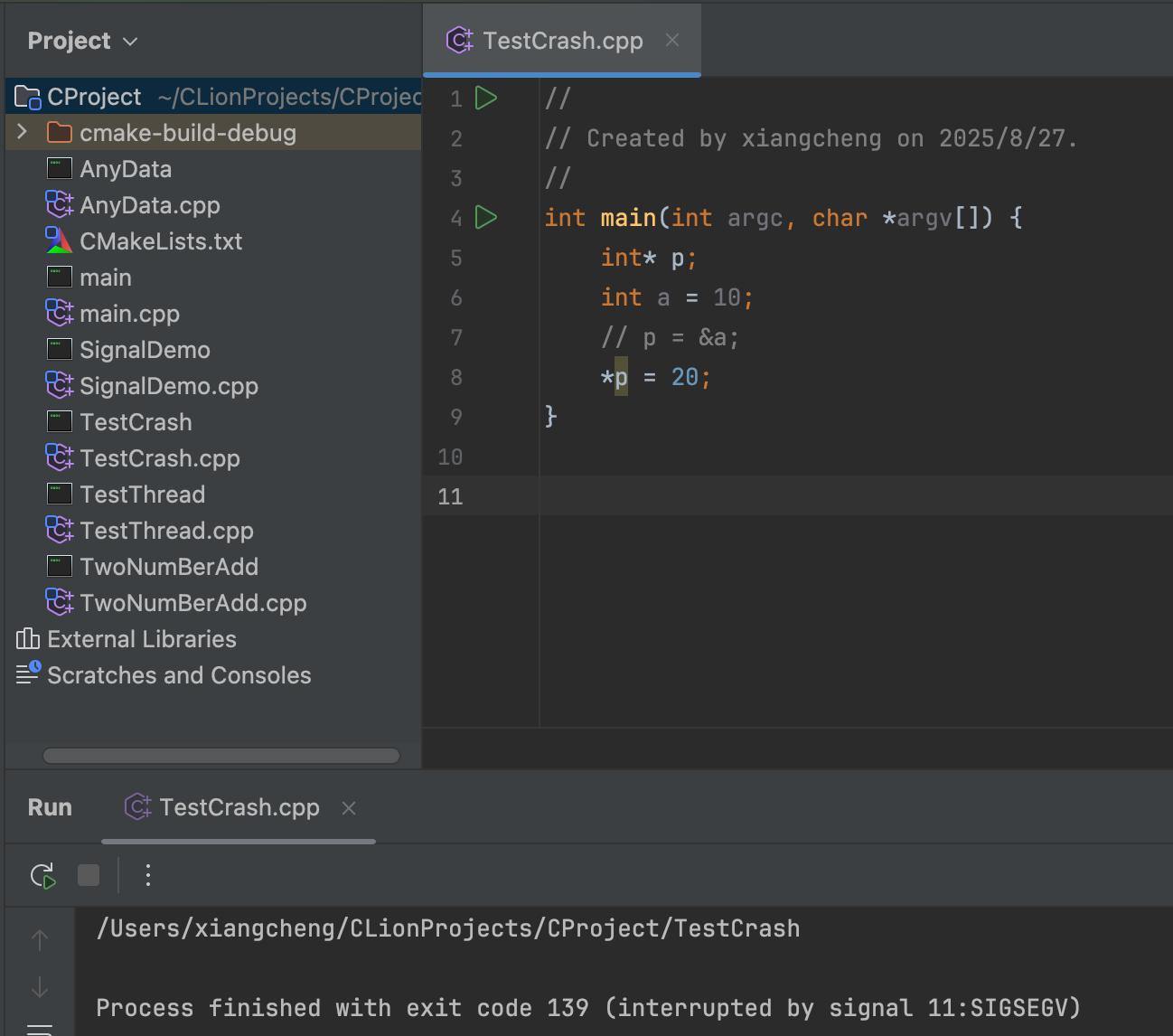 - Signal 11 (SIGSEGV):因为SIGSEGV信号失败的,和上面的clion中一致。