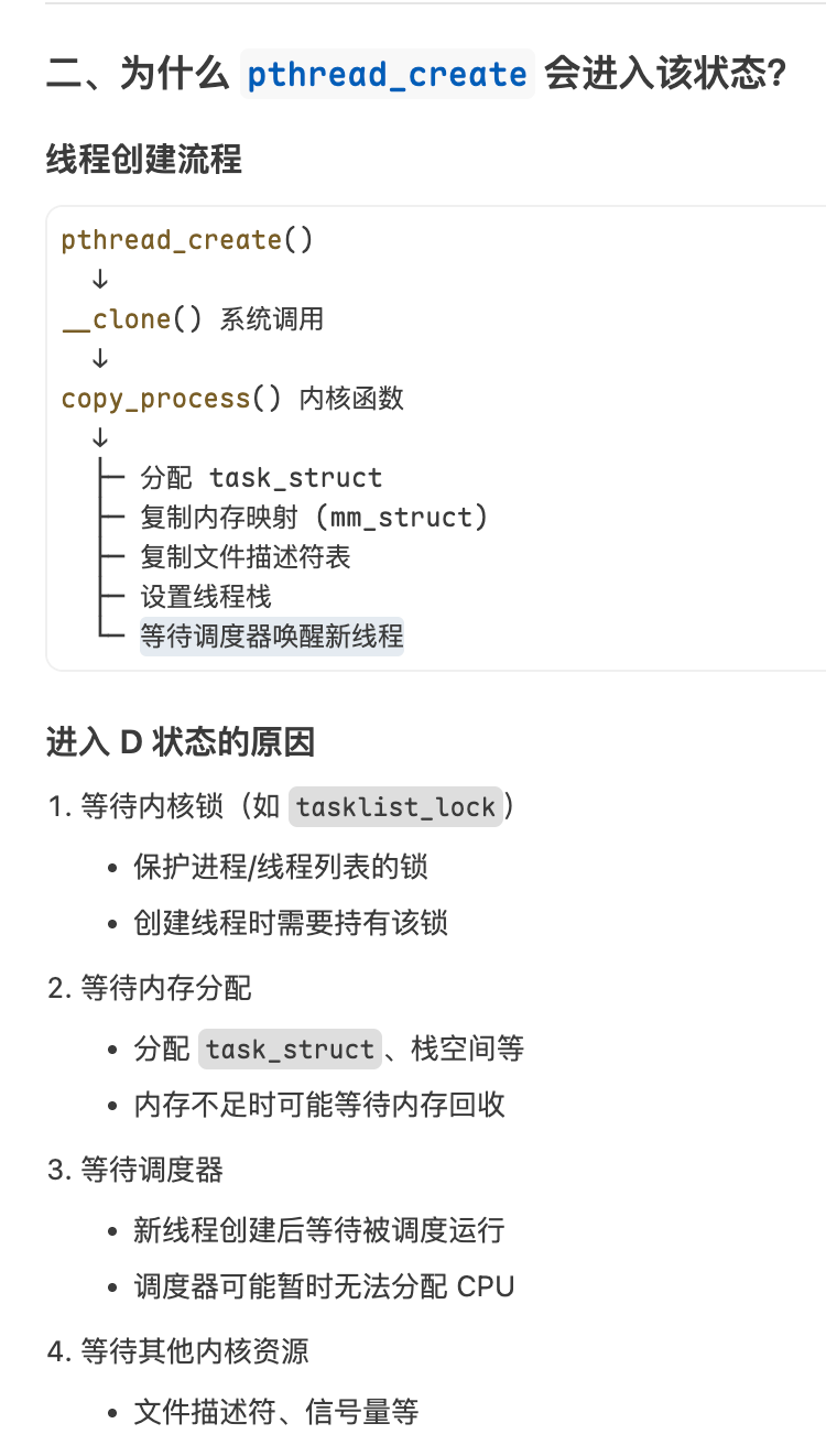 不可中断睡眠,但不是由I/O操作引起的。不可中断的意思是不可被信号(SIGKILL除外)唤醒,必须等待内核操作完成,保证内核数据一致性。常见在我们pthread_create方法会进入该状态:
